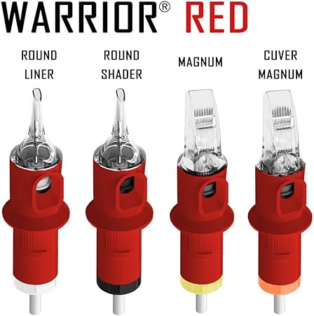 Cartuchos esterilizados para tatuaje. Los cartuchos WARRIOR Rojo RED-0801RL están fabricados asegurando la máxima precisión en cada trazo. Su diseño desechable y esterilizado promueve una experiencia de tatuaje segura y eficiente, libre de preocupaciones por contaminación cruzada.
