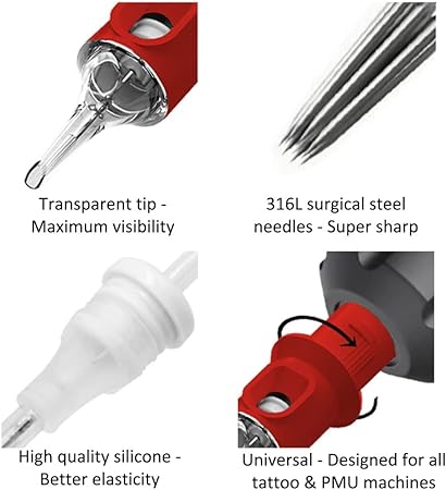 Cartuchos de tatuaje con punta transparente. La incorporación de silicona de alta gama mejora significativamente la comodidad y precisión durante el tatuaje, mientras que su punta transparente asegura una visibilidad sin precedentes para el artista.